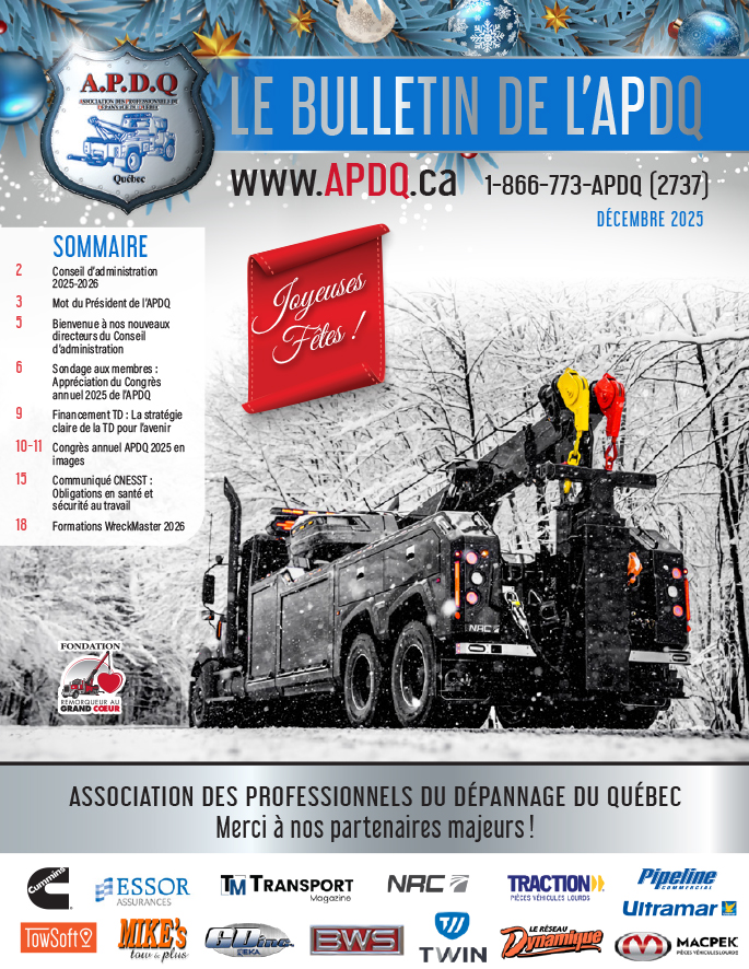 L’Association des Professionnels du Dépannage du Québec regroupe et représente les entreprises de dépannage de toutes les régions du Québec. Reconnue comme un acteur incontournable du réseau routier, l’APDQ agit chaque jour pour défendre les intérêts de ses membres, améliorer les conditions d’exercice du métier et faire reconnaître le professionnalisme des opérateurs de dépanneuses comme intervenants de première ligne.